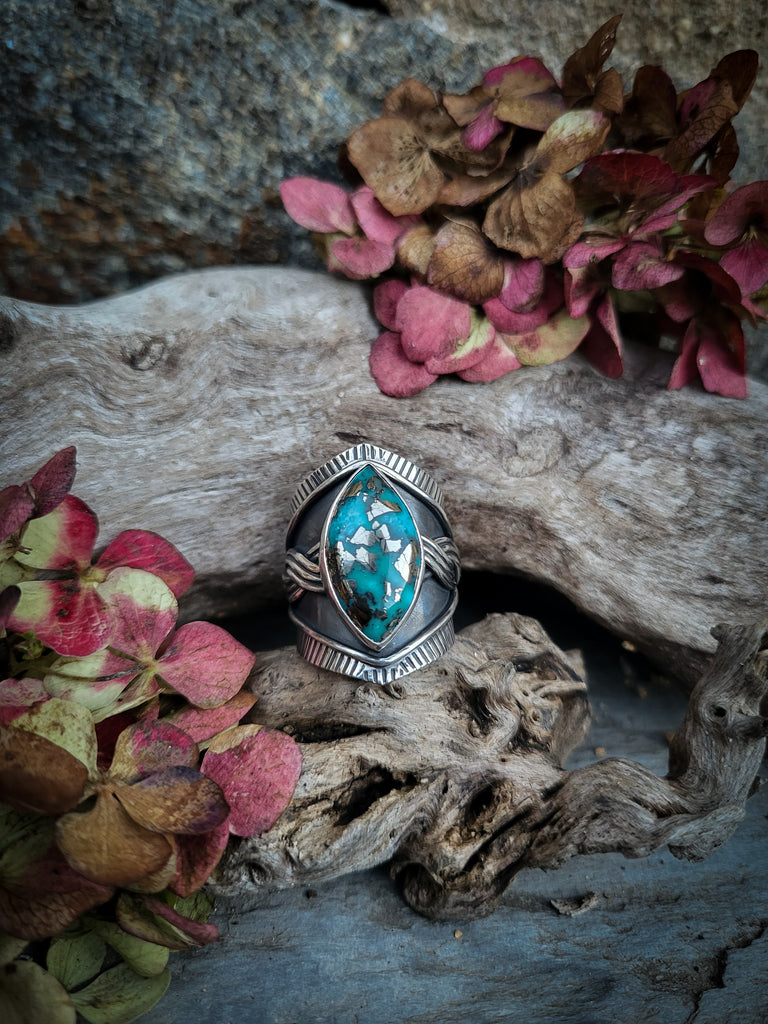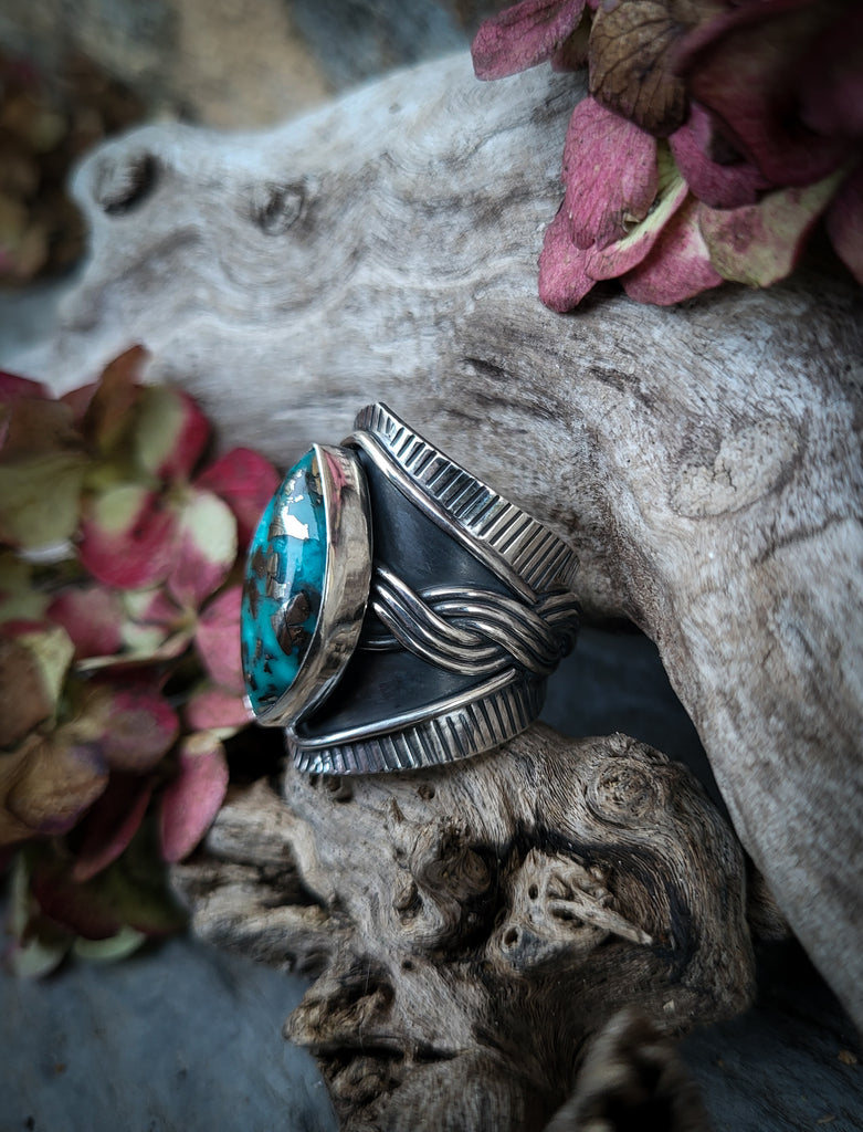 Bague argent 950 et turquoise a inclusion de pyrite taillée par mes soins.
