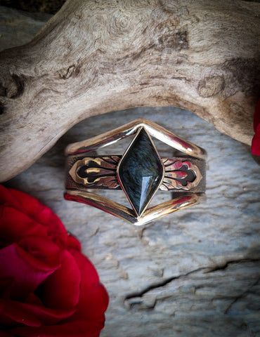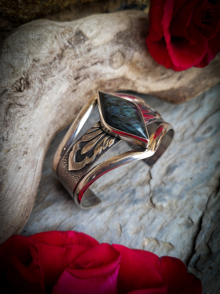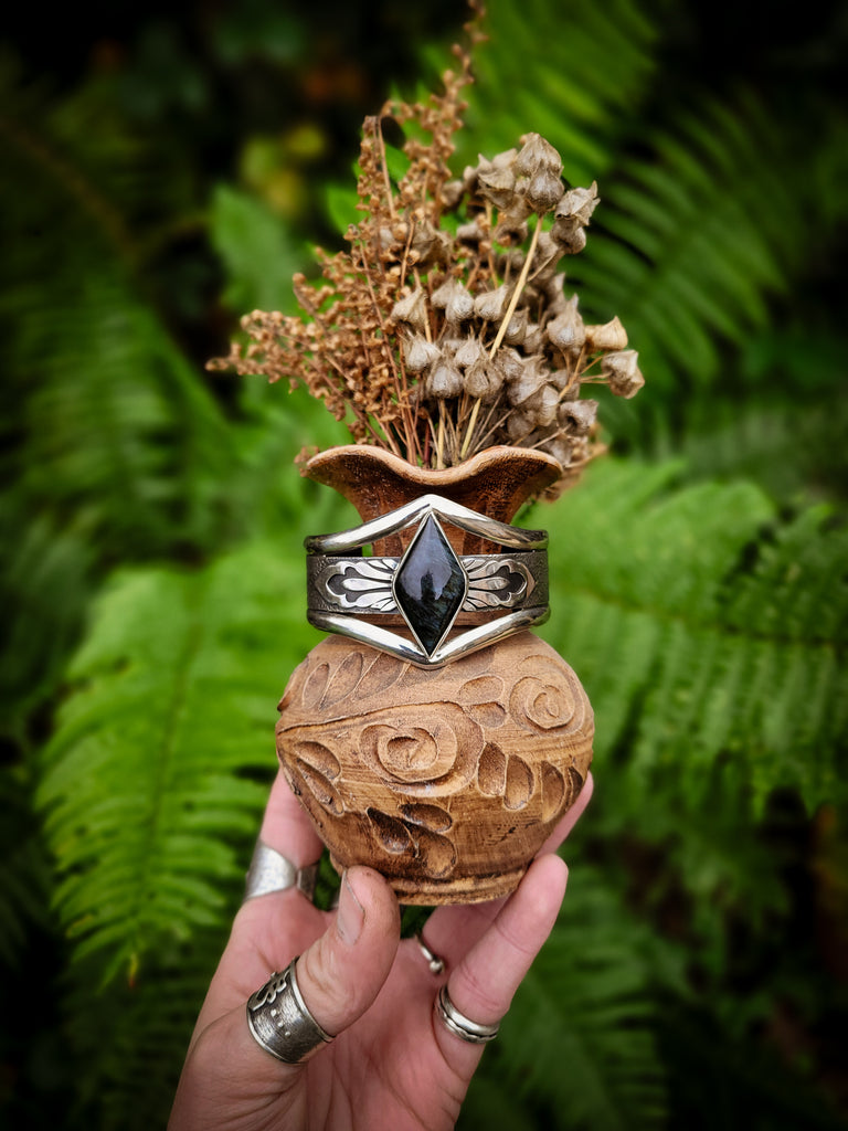 Bracelet argent 950 et obsidienne manta huichol taillée par mes soins.